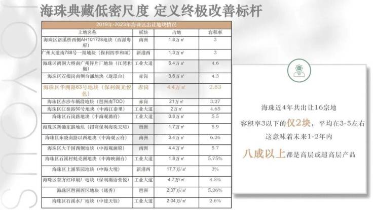 【低容积率土地稀缺】海珠近4年出让16宗地块,低于容积率3的仅2块,湖光就在其中,在中心区住宅持续向超高层靠拢的趋势下,低密叠墅产品占据了更多自然资源,在城市中心尤显珍贵及稀缺。