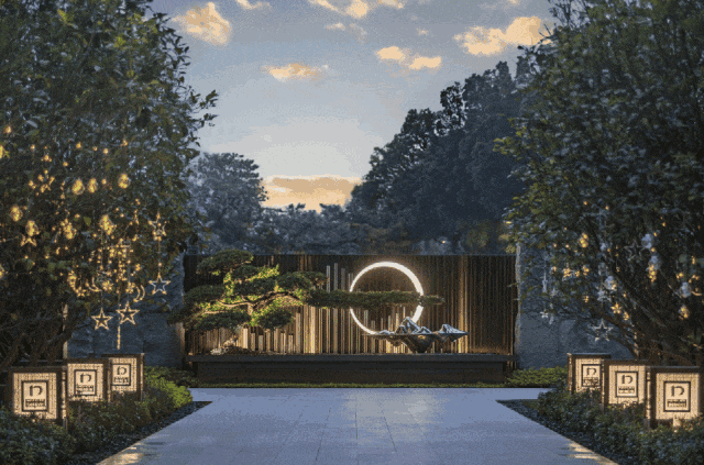 项目独具匠心地将“云山珠水”引入园林中。从步入大门,乘月归家、肆水归堂、碧影浮翠、山景会客厅、叠级水景墙,五大归家礼序层次在眼前铺就。罗汉松、冬青、樟树、朴树、乌桕等名贵树种,在两旁相迎。