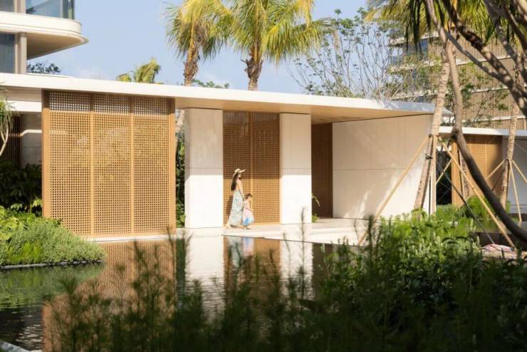 项目会所依托海棠河生态公园,打造了一座谧林庄园。利用起伏地形和雨树营造出庄园入口的隐秘感,通过果岭草地过渡至落客区,由沙生植物夹道、老桩鸡蛋花景树、竹编落客廊架、入口水苑次第展示着落客的礼仪与热带的风情。