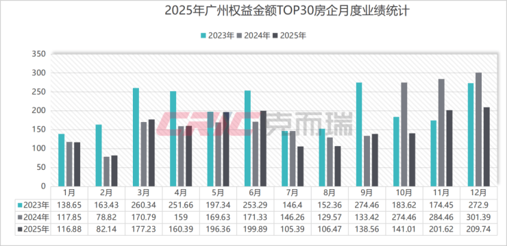 其中12月权益金额TOP30房企业绩规模209.74亿元,同比减少30%,环比增长4%,同时也是2025年以来TOP30房企房企月度业绩突破200亿元的第二个月。