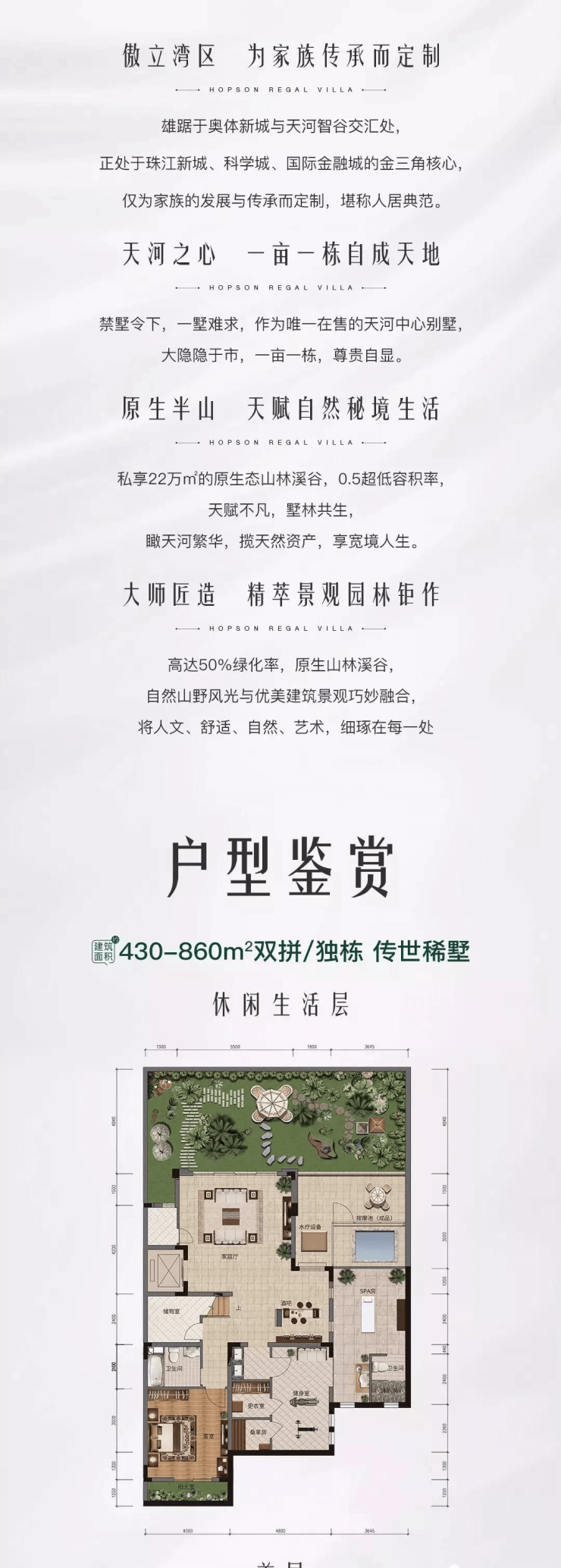 作为天河唯一纯别墅区,三大公园环绕,独有22万㎡山林溪谷。860㎡山林纯别墅,一亩一栋。