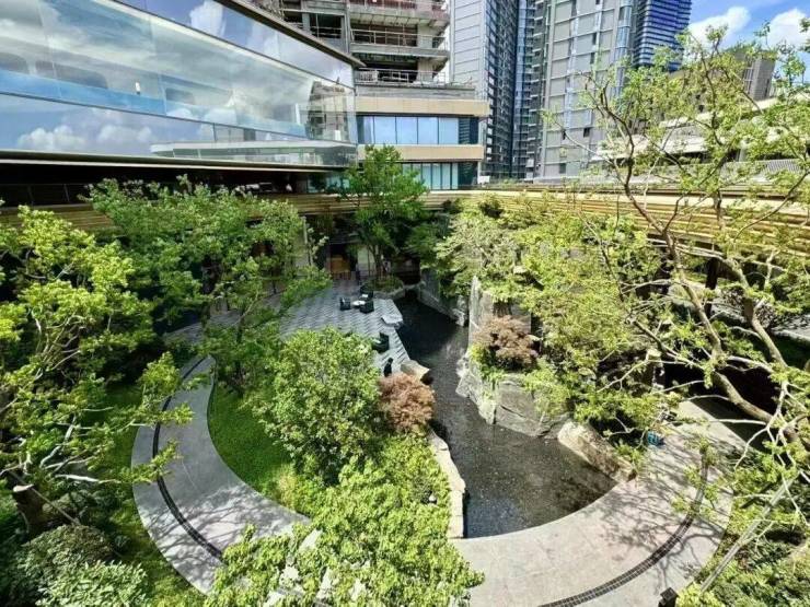 华樾小区园林秉承“外得江湖、内得山水”的造景理念,将传统园林的空间手法转移到园区内部,形成营山置水、建廊种树、以小见大、造廊架桥、堆山引水的前庭后园,再依托层层退台的建筑形态打造山水园林景观。