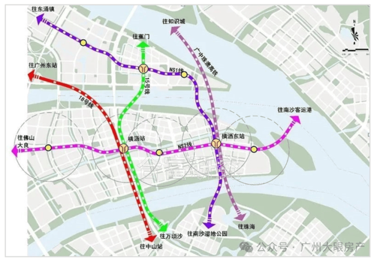 项目距离地铁18号线横沥站约400米不到,横沥岛规划地铁 18 号线、广中珠澳高铁、地铁 NS2 线、地铁 15 号线、 地铁 NS1 线。其中,横沥站为 18 号线、15 号线、NS2 线三线换乘中心,横沥东站为 广中珠澳高铁、NS1 线、NS2 线三线换乘中心。