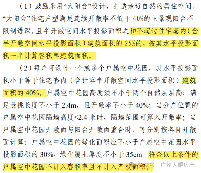 “大阳台”不超过套内建面的25%计一半计容建面,“空中花园”不超过套内建面的40%不计入产权面积。