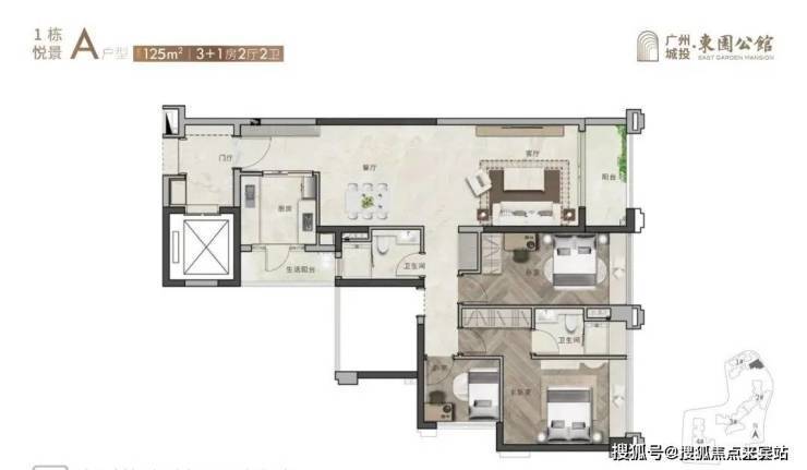 120平3+1房和125平3+1房AB两个户型:分东北、东南、西南向,其中125平竖厅户型为南北对流。