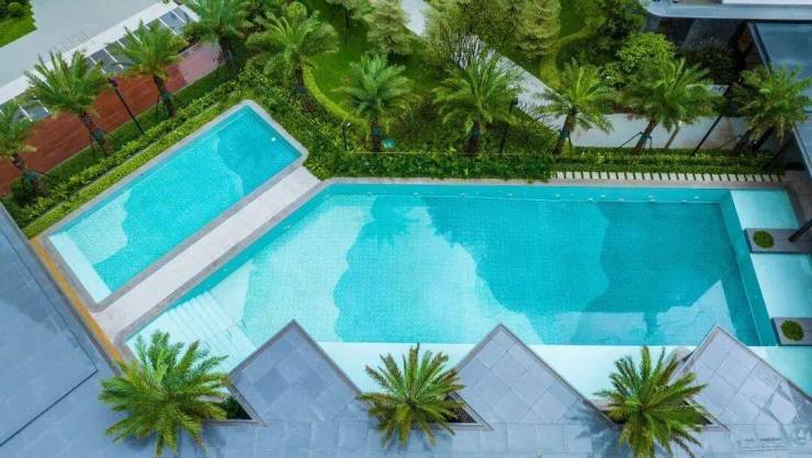Tiffany蓝玻璃泳池,旁边就是休闲的假日生活馆。泳池参考三亚奢华酒店edition,四周种植银海枣、红花玉蕊等热带植物,别有一番风情,夏天纵身一跃,就能享受夏日清凉,宛如度假一般的奇妙体验。