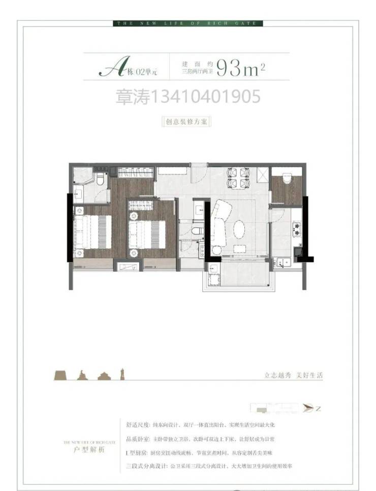 A栋02单元超高性价比93㎡三房户型: