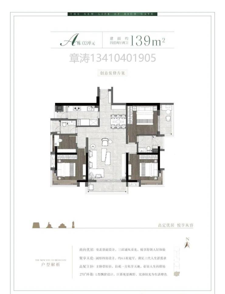 A栋03单元三面采光三阳台139㎡稀缺南向四房户型: