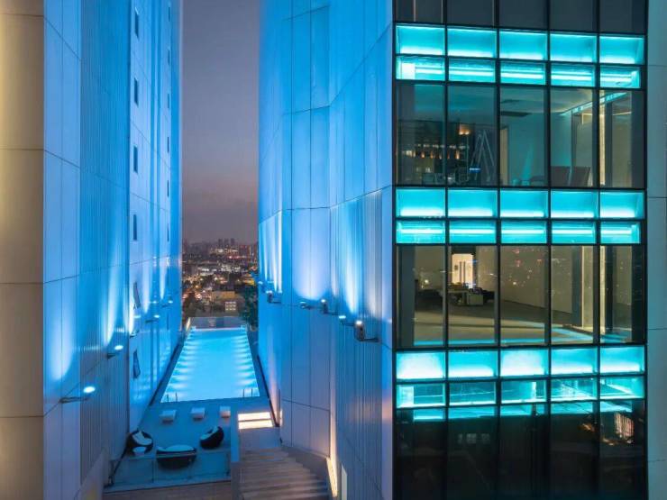 云端泳池:以 “里重外轻” 结构控制梁高,搭配一体化预制亚克力,整体吊装至 25 层,实现悬空轻盈质感。严控超高层变形值域,规避渗水风险;擦窗设备藏于下层塔楼,同层设轨道,兼顾立面美观与泳池运维便利。