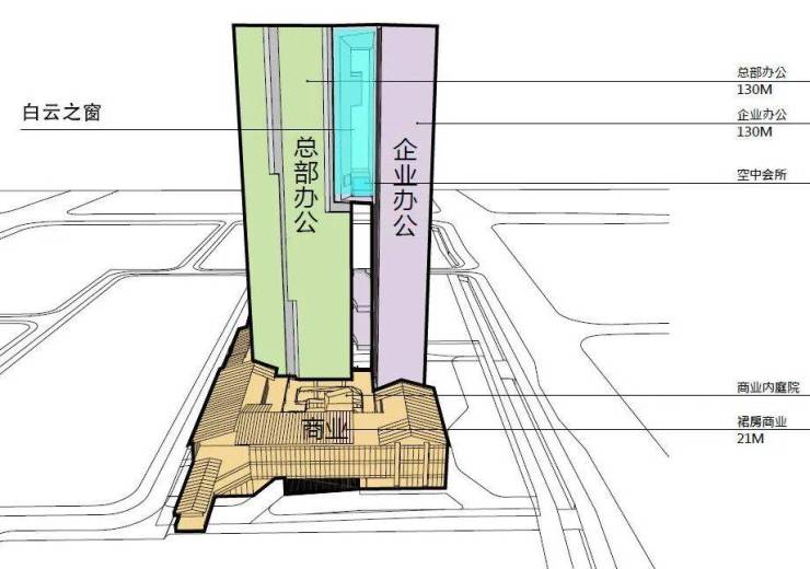 地块布局巧妙,超高层塔楼紧贴北侧控制线,确保最大景观面的同时打造地标意象。与之呼应的裙房和骑楼以“U”型置于塔楼对角,自然围合出东方意境的中央庭院,同时向外包览白云新城中央景观带。