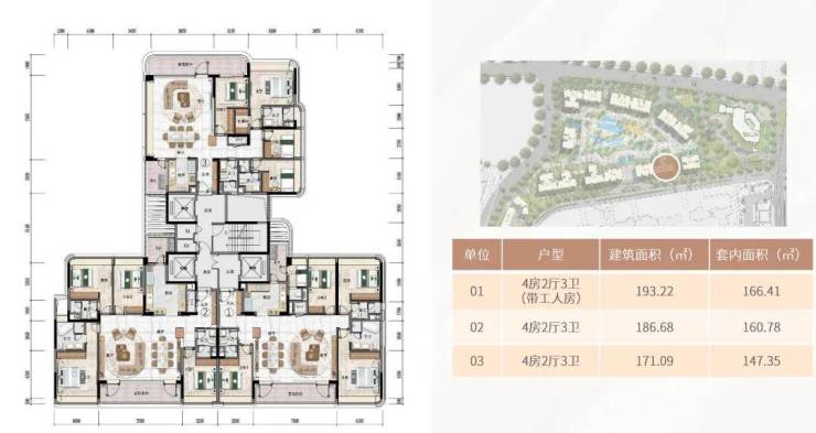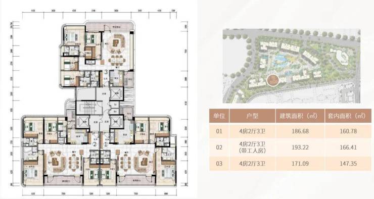 3#、4#、14#则为3梯3户,主要分布的户型为171-196平的三至四房单位。