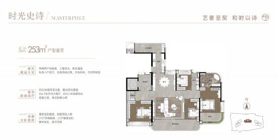253平是四房两厅两卫户型,竖厅设计,南北对流,阳台有10米长,特点是主卧的飘窗和主卫都是270度弧形采光面,视野采光一流。