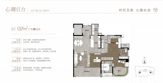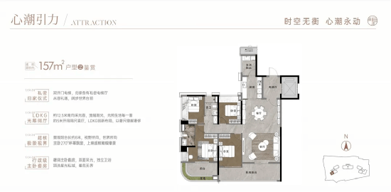 157平是四房两厅两卫户型,是传统的竖厅设计,动静分区,厨房后面有一个生活阳台,主卧设计了270度弧形飘窗,视野采光好。