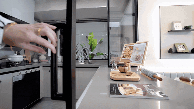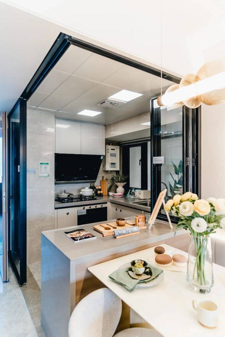厨房可以打造成半开放式餐厨,安装推拉式玻璃门,烹饪时可以随时隔断,它既是一个品味生活情趣的实验室、又是偶尔和朋友轰趴的客串吧台。