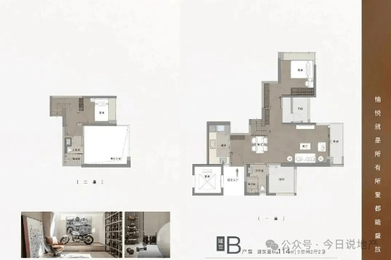 114㎡复式户型看上去就实用很多,因为项目是2018年报建的,那时还没禁复式令,所以耀胜尊府这个是真复式,得房率非常高。