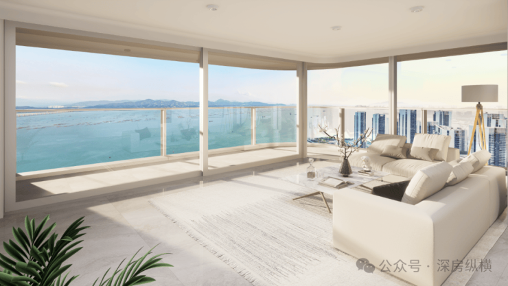 信悦湾主力户型客厅采用270°环幕无角柱设计,搭配弯弧玻璃、提升推拉门与大固定扇,将深圳湾大桥、歌剧院与城市繁华段全景引入室内,尽揽湾区美景。L形阳台则进一步延伸了观景界面,无遮挡直面海港景观。
