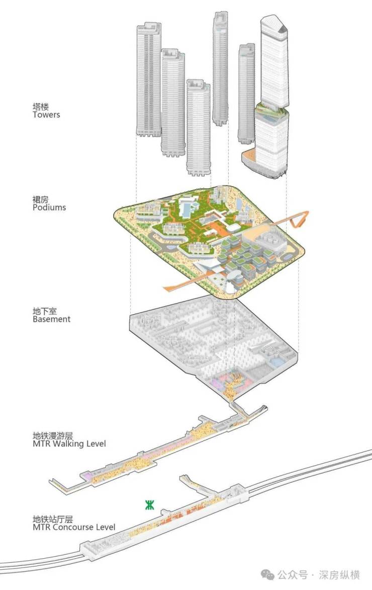 其三,构建高效互联的立体交通网络。项目通过与深圳地铁集团协调优化布局,设置下沉广场实现地铁站与商业街区的无缝衔接;同时整合首层、二层与地下步行系统,打造 “出地铁即到家” 的高效体验,既提升居民生活便利性,也为物业价值赋能;更通过漫游层直联歌剧院艺术街区,实现全域场景动线互通。