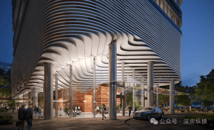 建筑立面以“现代极简”为基调,融入深圳滨海城市特质:柔和曲线造型如同风帆与海浪,与南侧深圳歌剧院呼应;基座则以“海浪拍打岩石”为灵感,采用多种砂岩质感石材,形成水平层叠线条,托起通透轻盈的塔楼,形成强烈质感对比。