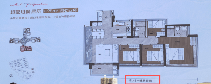 其中,98平做到了四开间朝南,南侧面宽有13.45米,只比118平的面宽少了10公分,尺度感非常不错。