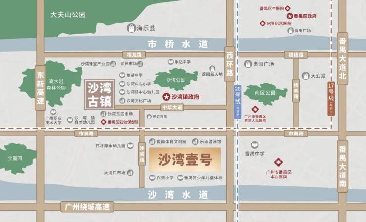 沙湾壹号,紧邻市良路与西环路双主干道,近享荔园新天地、奥园广场等繁华商圈。周边覆盖全龄段优质教育资源及番禺中心医院等医疗配套。未来双地铁(17/26号线【规划中】)加持,直通广州核心区域。