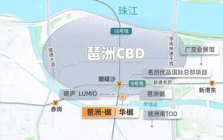 最近的地铁,还是琶洲西区最核心、8/18号线双线交汇的磨碟沙地铁站,仅隔着一条新港东路,直线距离约200米。