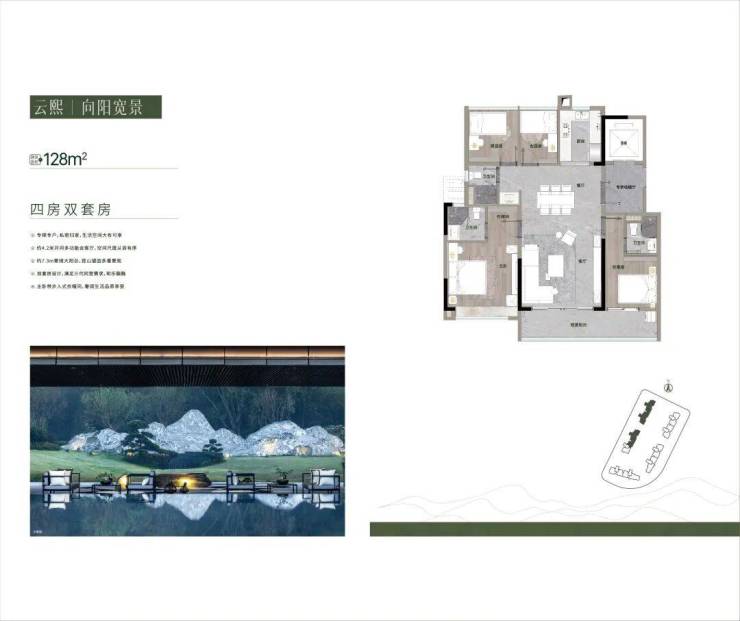 128㎡|四房三卫,专梯专户,私密归家,约4.2m开间多功能会客厅,空间尺度从容有序。约7.3m奢阔大阳台,揽山望园多重景观。
