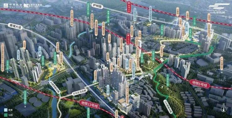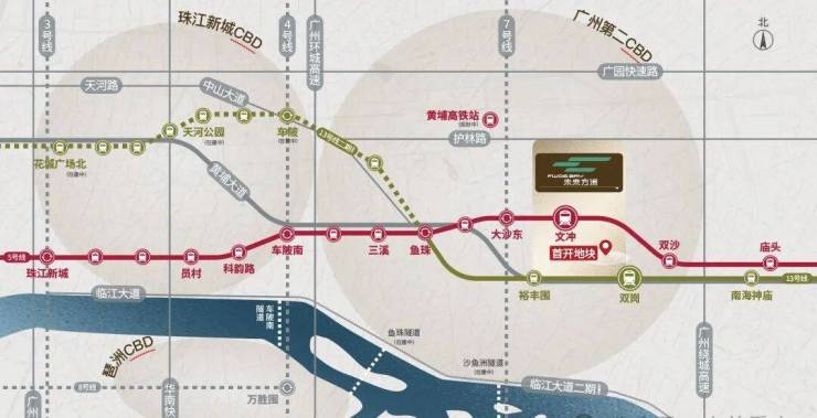 双黄金地铁线:5号线文冲站及13号线双岗站,3站金融城,6站琶洲,9站不换乘直达珠江新城板块