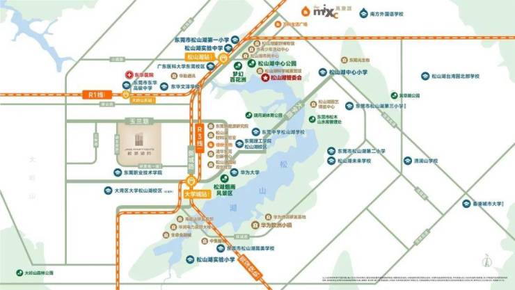 松山湖中部,三甲医院、世界级大学、众多科创机构和高新技术企业林立,乃松山湖宜居+科创的代表,板块价值位处松山湖塔尖。