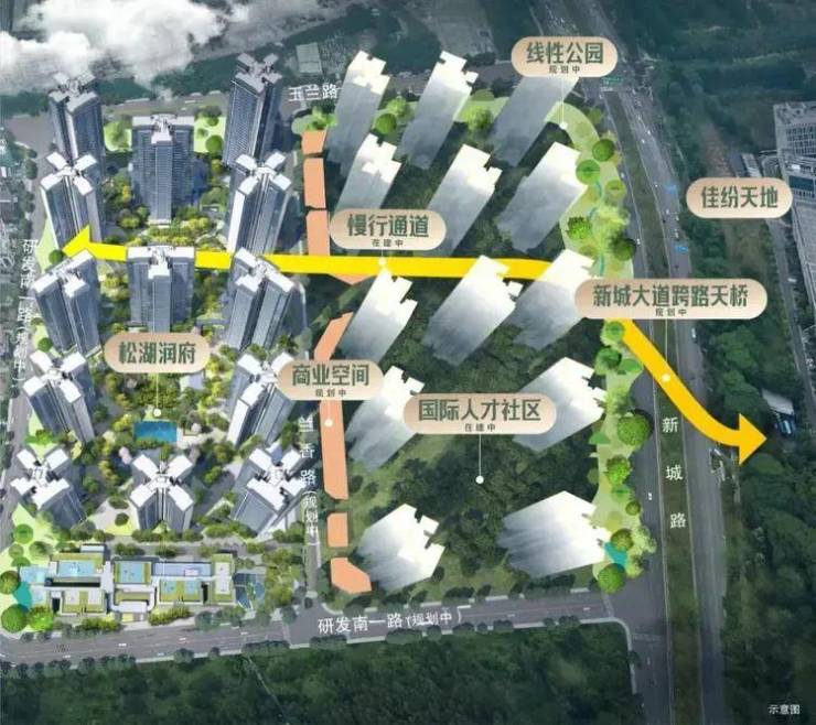 *2023年6月7日,华润置地成功中标松山湖科学城国际人才社区项目配套工程代建服务,将配建约2万平米线性公园(规划中),大商业空间(规划中),打造约470米天桥(规划中)链接慢行通道直达佳纷天地、串联松湖烟雨。华润置地以城市运营开发理念、深度参与城市空间建设规划,升级区域配套,再造片区“生命力”。
