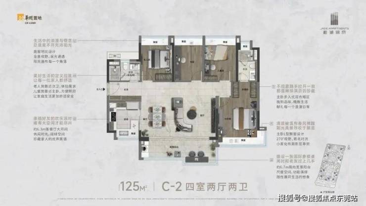 125㎡户型则做到了景观朝向,等宽横厅,餐厅预留电器墙,男女分区独立衣帽间等等,看过都会秒变“小迷妹”。