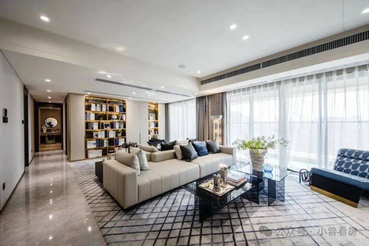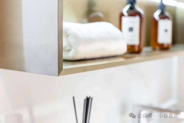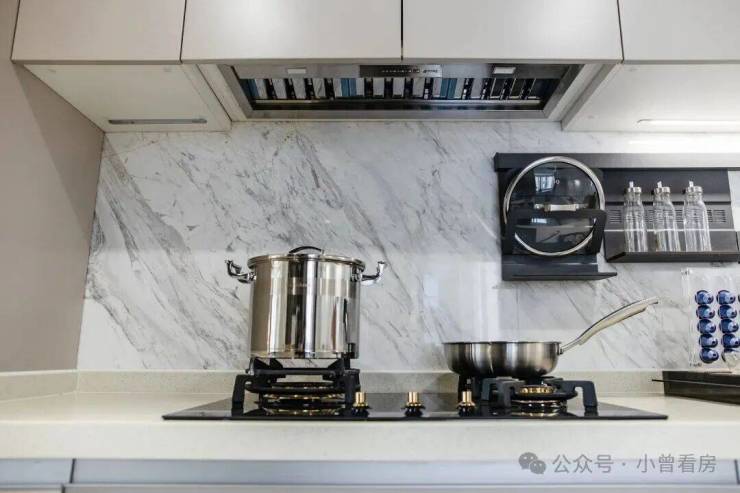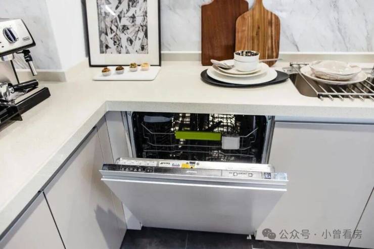 平滑细腻的视觉感受,与客厅的空间设计、材质相统一。为了使厨房空间更具观赏性,设计师将烟机、冰箱、洗碗机隐藏,厨房整体线条更加流畅。