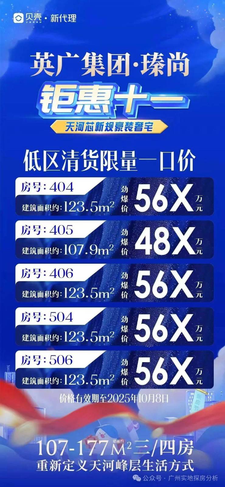 4、产品与配套定位高端改善,户型面积107-177㎡,涵盖三至四房,部分高层户型可瞰白云山或珠江新城景观。配备室内恒温泳池、健身房、瑜伽室等高端会所设施,园林由日本设计师操刀,大堂挑高约8米,装修标准对标珠江新城豪宅。