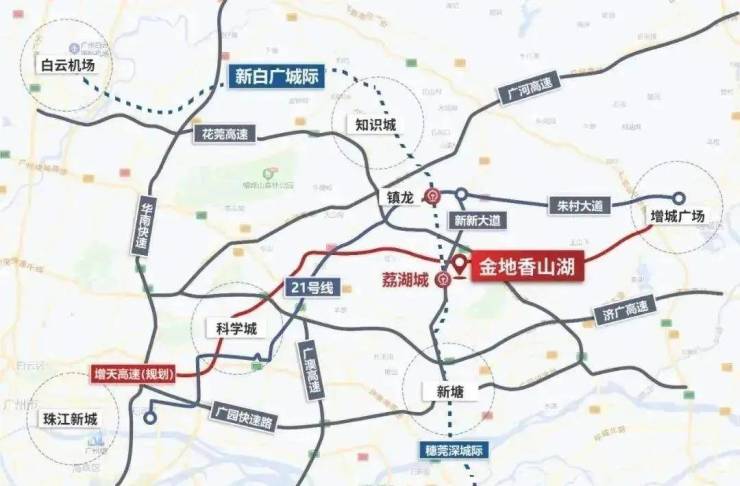 穗深城轨荔湖城站(新白广段,在建中)就在家门口,一站换乘广州地铁21号线(镇龙站换乘),快线3站到天河,更可直达广州白云机场和深圳宝安机场;出门即享花莞高速(已开通)、增天高速(已动工)双高速出入口,直达天河珠江新城;新新大道(改造中)、广园快速路和广汕快速路等,构建四横四纵城市快速交通网。