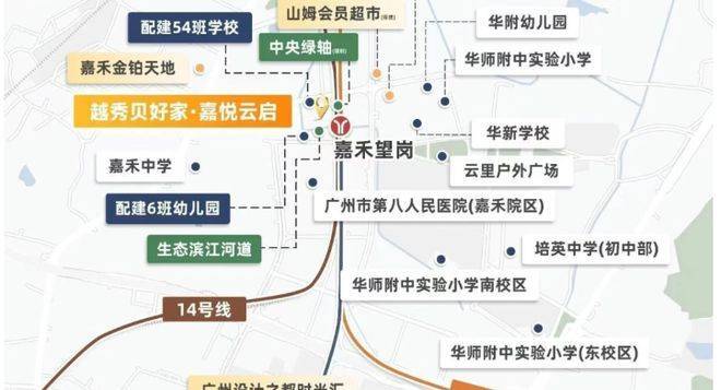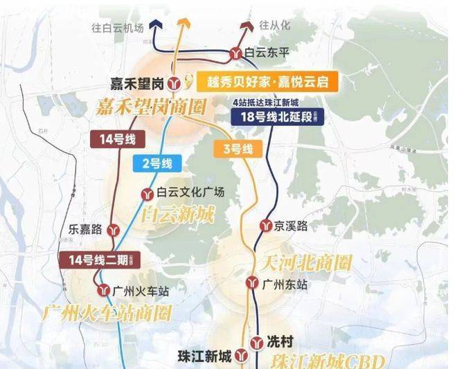 越秀嘉悦云启位于广州市白云区空港大道与望岗大马路交叉口处,与广州地铁 2 号线、3 号线、14 号线交汇的嘉禾望岗站直线距离仅约 50 米。这一得天独厚的交通优势,使其能够便捷通达城市各处,3 站可达白云新城,4 站直抵珠江新城,0 换乘覆盖主城 8 大商圈核心。未来,规划中的 18 号线北延段更将进一步提升其交通便利性,实现 5 站到琶洲、8 站至番禺万博。同时,项目坐落于白云新城南北中轴轴心区位,所在板块规划为白云新城嘉禾望岗商务核心区,致力于打造产城融合的 TOD 综合开发示范区,发展潜力巨大。