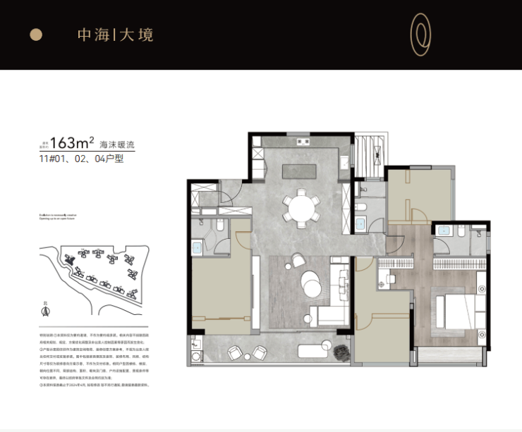 11栋04约163㎡户型,是社区内唯一东南看花园产品,约260米视觉通廊,2万㎡花园尽收眼底。