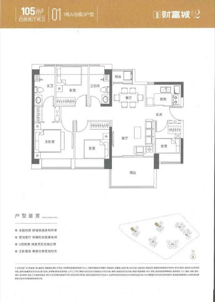 105㎡的4房2厅2卫,设计的是竖厅南北通透格局,客厅3.5米开间,全屋飘窗双阳台设计,4个卧室分别是3.25/2.85/2.6/2.1米的宽度,U型厨房,得房率约:76%(不含赠送),阳台主朝西南向。