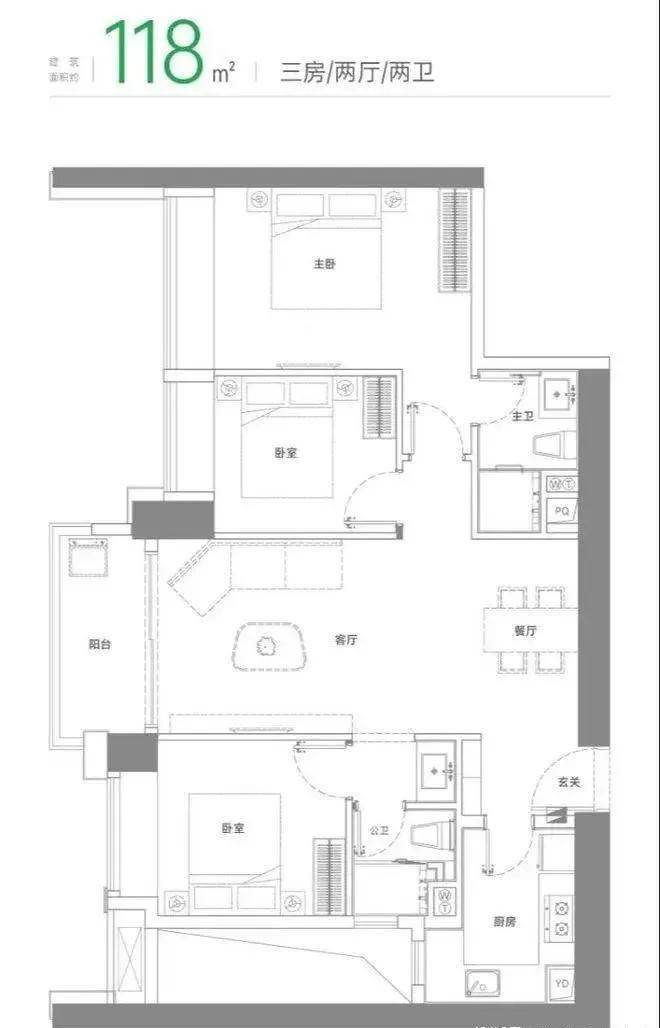 建面约118㎡三房两厅两卫