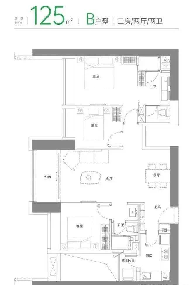 B户型建面约125㎡三房两厅两卫