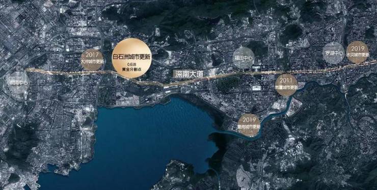 在伦敦、纽约这样的超级城市,其城市主轴的黄金分割点上均屹立着城市超级影响力的项目,如伦敦金丝雀码头、纽约中央公园,而深圳的发展主轴深南大道从罗湖中心到前海中心,绿景白石洲正处于黄金分割点之上。