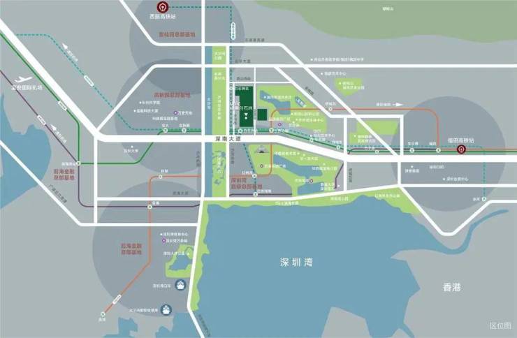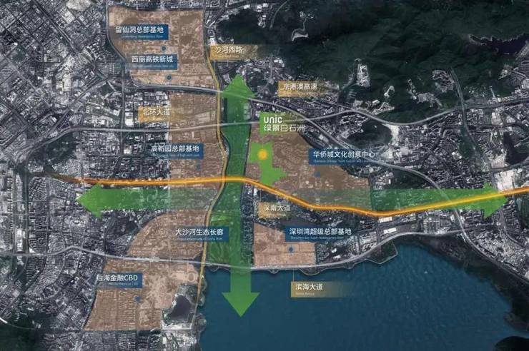 绿景白石洲位于深圳核心位置南山区的华侨城片区,深圳城市发展主轴——深南大道与大沙河创新走廊十字交汇点,依托华侨城人文艺术城区,链接后海总部基地、深圳湾超级总部基地、留仙洞总部基地、高新园总部基地四大总部基地。