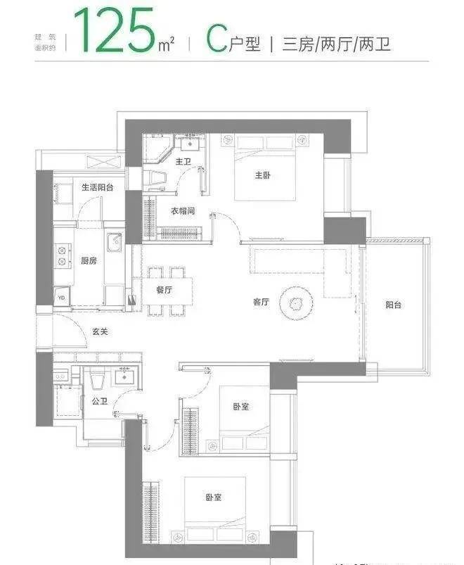 C户型建面约125m²三房两厅两卫