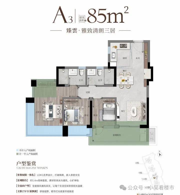 建面85平三房,约100%使用率,LDKG一体化设计,约11.6米南向采光面,三间房都是南向,主卧带270度转角飘窗,总价215万起。