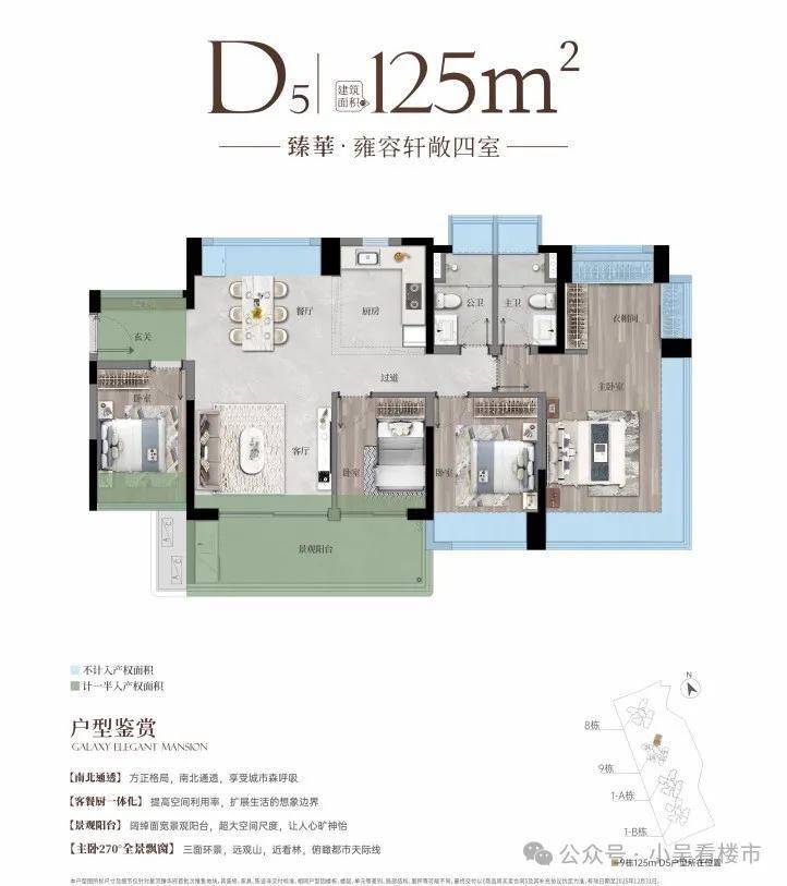 建面125平四房两卫,南北对流户型,主卧做了衣帽间,改善客户的首选,首开这个户型只有32套。