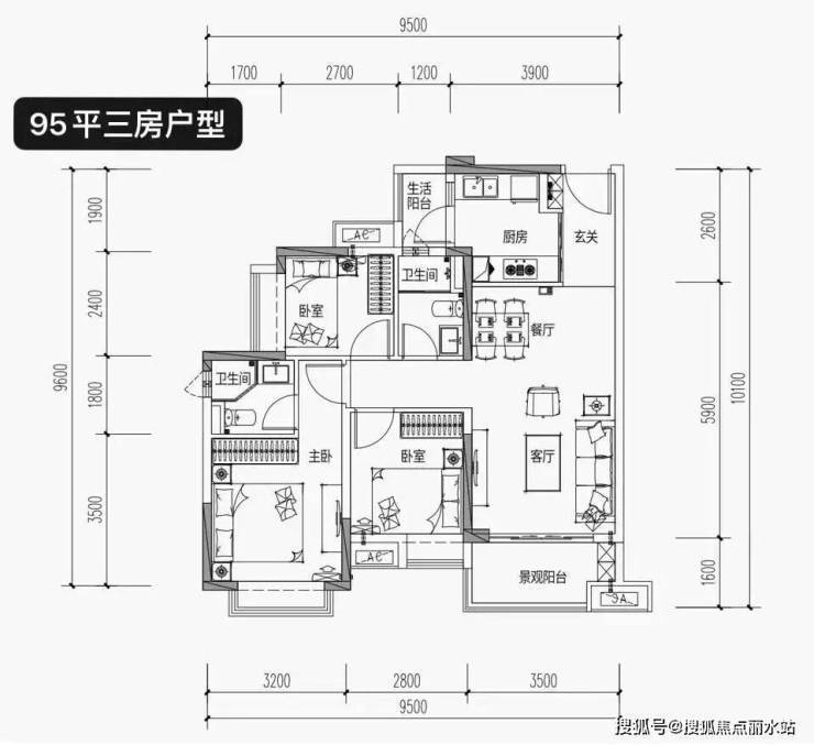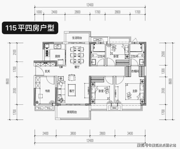 5号楼2梯4户设计,分为95平三房和115平四房,楼栋均价为3.62万/平,户型图分别如下。
