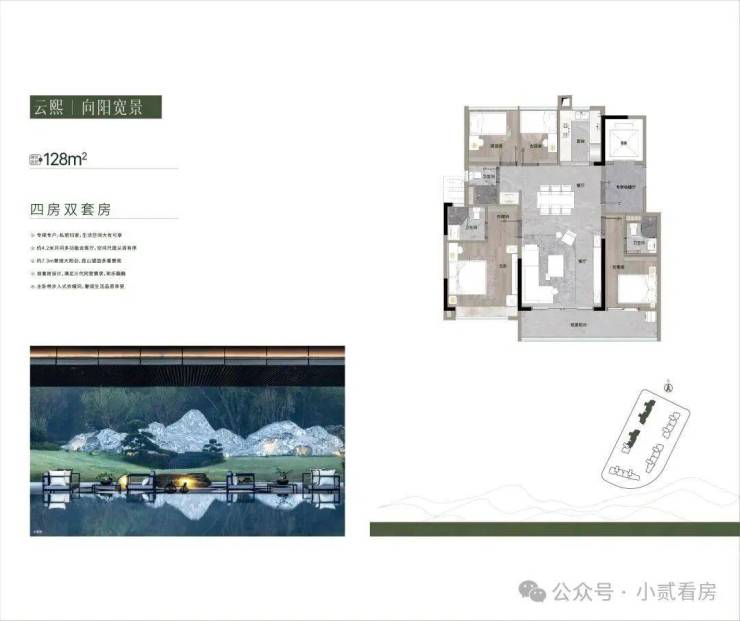 128㎡|四房三卫,专梯专户,私密归家,约4.2m开间多功能会客厅,空间尺度从容有序。约7.3m奢阔大阳台,揽山望园多重景观。