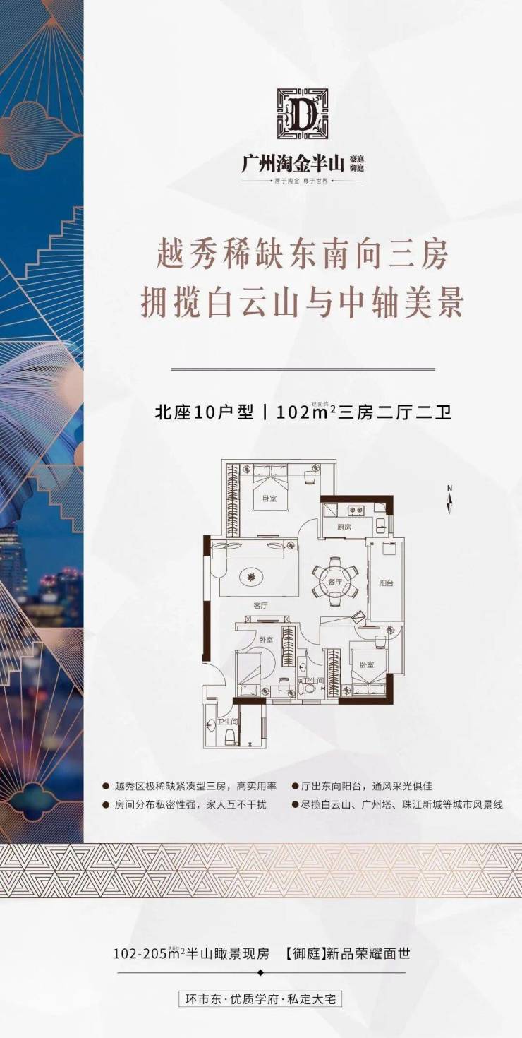 【淘金半山御庭 | 六大价值体系】项目地处越秀区环市东,是广州政治、文化中心,新楼盘供应稀少。项目享有卓越的地理位置,可俯瞰白云山、越秀山等景观,同时可欣赏到珠江新城的繁华景色。