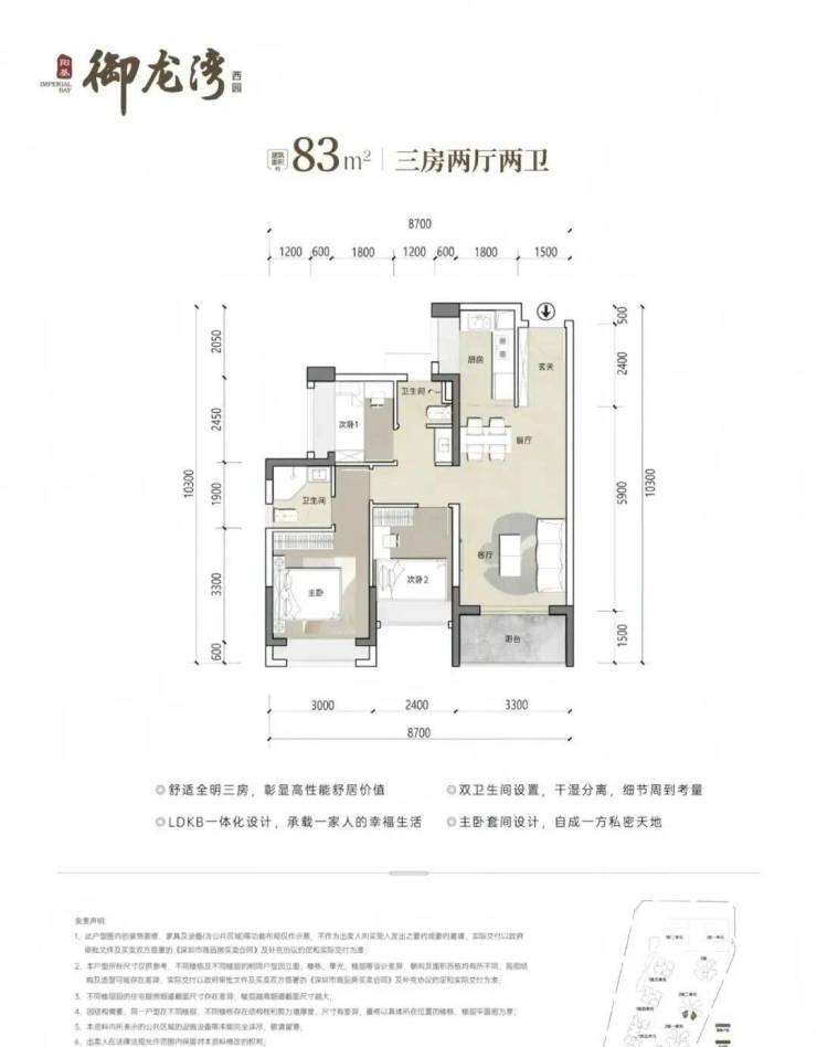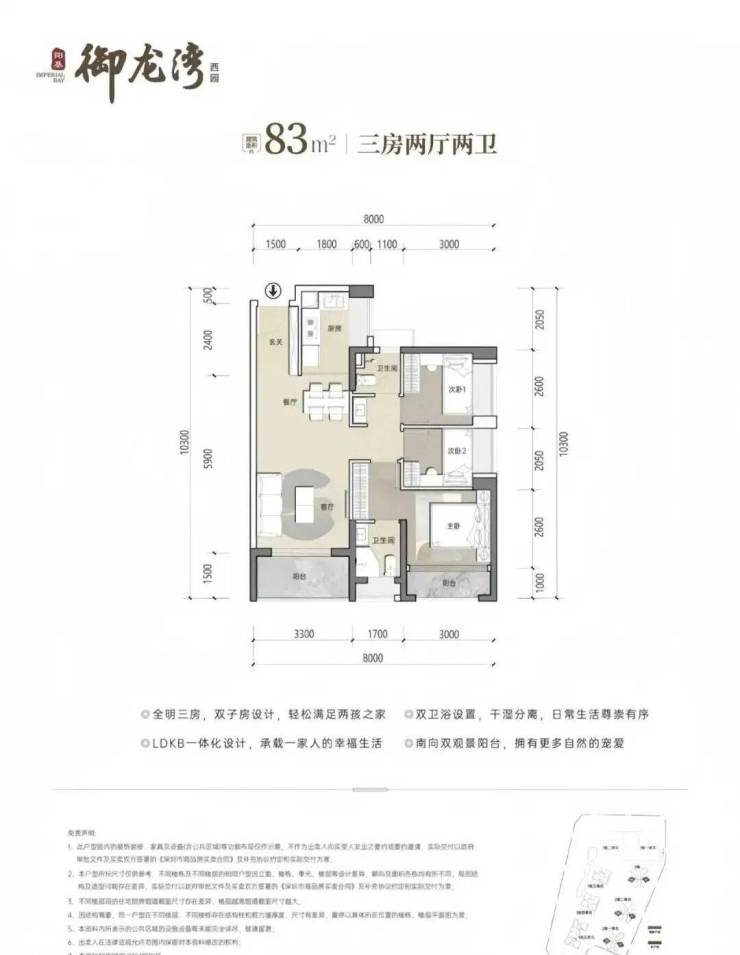 83㎡3房2卫,分布在2栋2单元03/04户型,设计的是竖厅格局,客厅开间3.3米,LDKB一体化设计,三开间朝南,U型厨房,公卫三段式分离设计,得房率约79.25%(不含赠送),东南或西南朝向,加上赠送得房率约89%