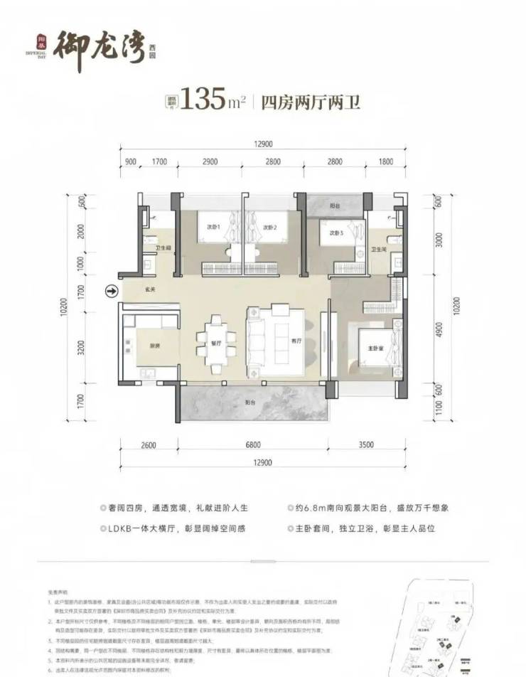 135㎡4房2卫,设计的是横厅南北通透格局,客餐厅开间6.8米,LDKB一体化设计,四开间朝南,U型厨房,公卫三段式分离设计,得房率约79.25%(不含赠送),阳台主朝东南或西南向,加上赠送得房率约90%