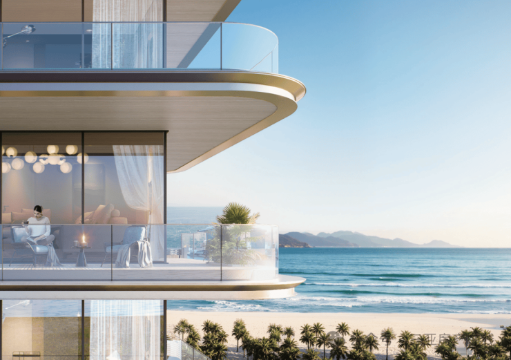 建筑以“超流体立面”呼应海浪肌理,通过悬挑阳台、底层架空消解建筑与水岸的边界,搭配 270° 观景阳台、云端泳池、环形瞰海露台等设计,让河景、海景与生活空间深度交融,成就“外揽海之豪迈,内藏河之幽静”的谧境岛居。