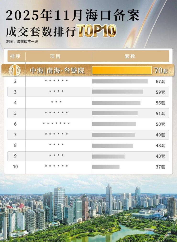 刚刚过去的11月,中海丨南海·叁號院,以70套销量(以备案口径)的绝对统治力,再次稳坐海口成交榜首,持续领跑。